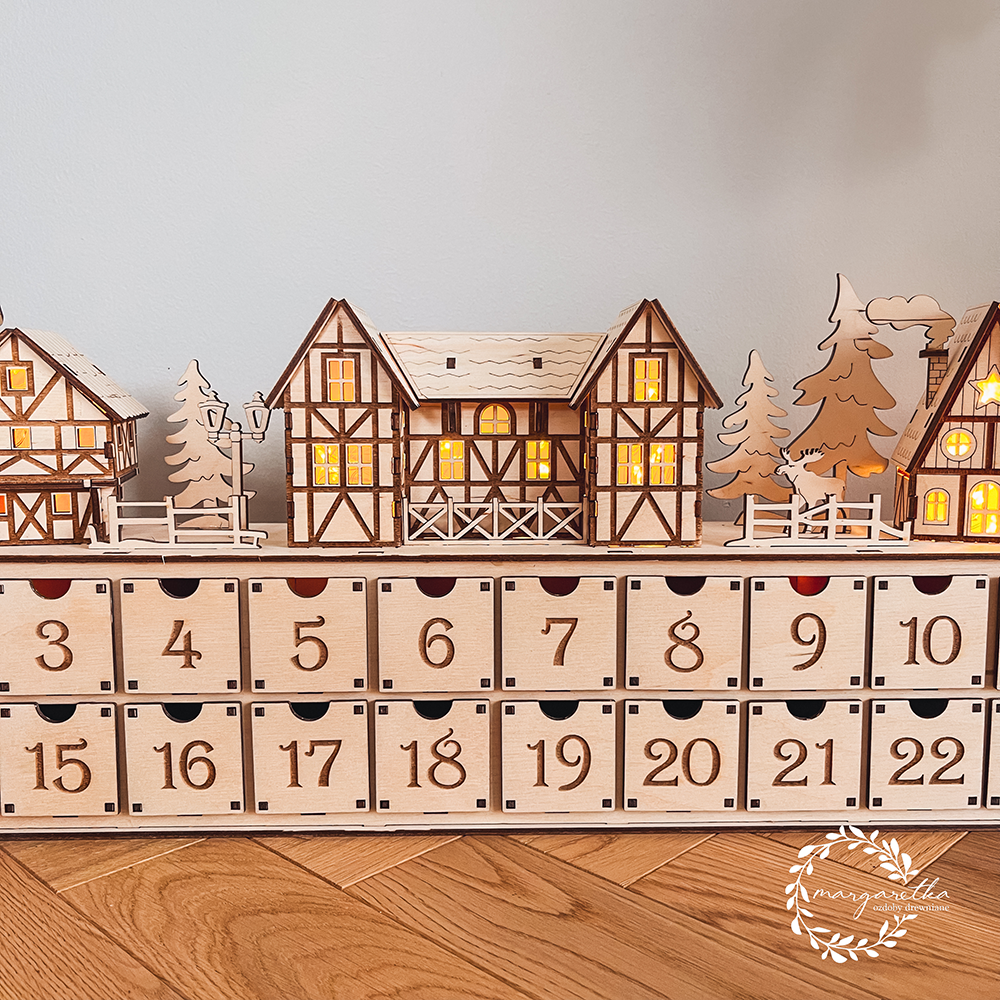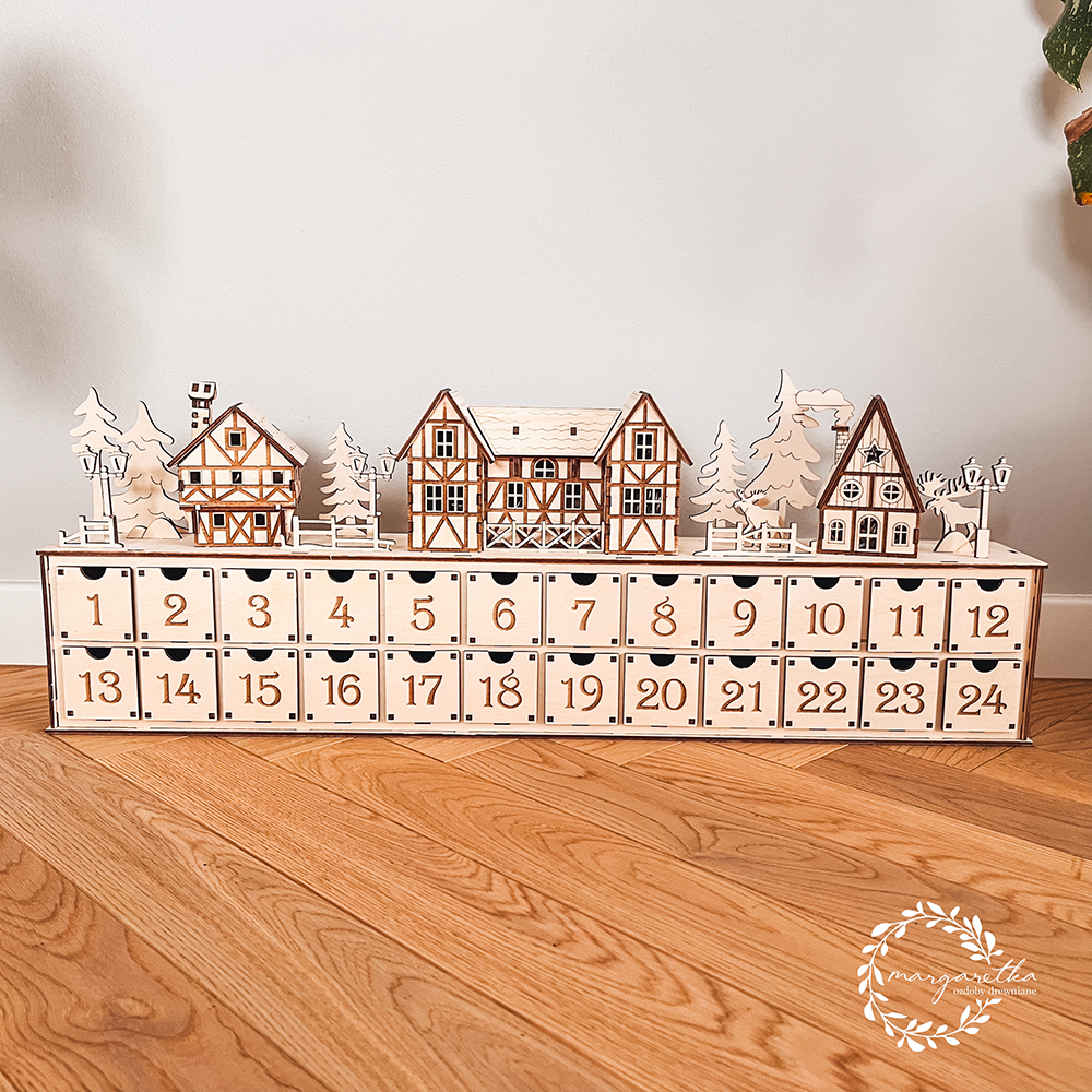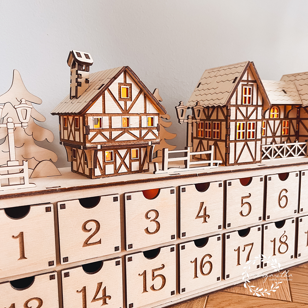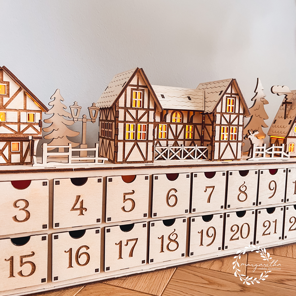 Drewniany kalendarz adwentowy z podświetlaną wioską i szufladkami